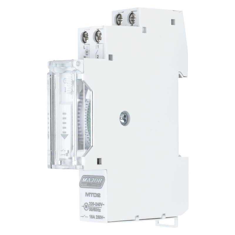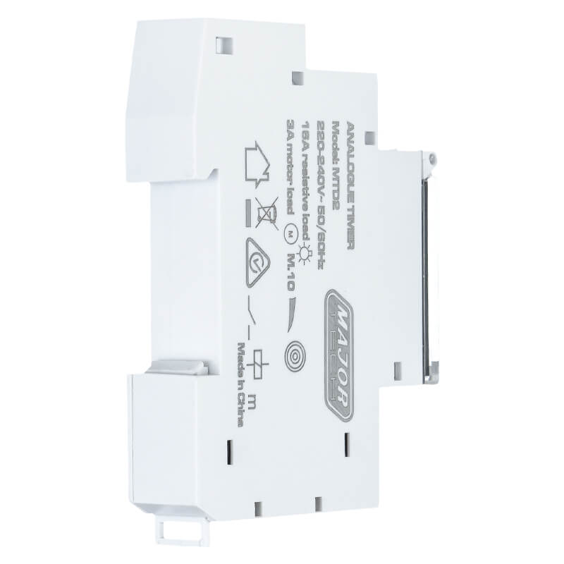 The MTD2 24 Hour Analogue Timer is a reliable and easy-to-use DIN rail mountable 16A time switch, ideal for automating electrical systems such as geysers, lighting, pool pumps, and other appliances. With 24-hour programmable switching, it allows precise control of electrical loads up to 16A, offering improved energy efficiency and operational convenience. The timer features 96 adjustable pins for daily settings, providing a minimum switching time of 15 minutes per pin. It includes a manual override function for flexible operation and an integrated 100-hour battery backup to maintain functionality during power outages. Designed for durability and performance, the MTD2 operates with a very efficient standby consumption of 0.5W, with a robust load rating of up to 2300W (Resistive load) and a constant 920W (Inductive load for Motors), and is built to meet stringent safety and installation standards.