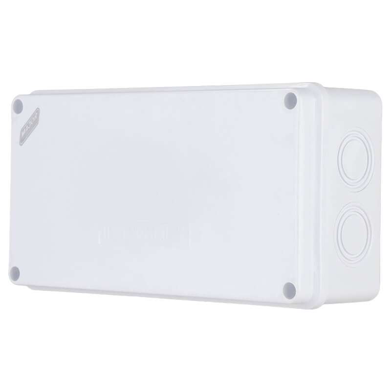 The VJ20107G is a high-quality rectangle electrical junction box, measuring 200 x 100 x 70mm, with an IP65 ingress protection rating, making it suitable for indoor and light outdoor applications. Designed with multiple pre-formed knockouts in various sizes, it offers flexible cable entry options for easier installation. Constructed from non-flammable, high-grade ABS plastic, the VJ20107G is both durable and lightweight. It features an IK08 impact resistance rating, ensuring protection against mechanical impacts in demanding environments. The product complies with international standards IEC 60529 and IEC 60670, and holds multiple certifications including CE, RoHS, HF test, IK test, and is manufactured under the ISO 9001 quality management system.
